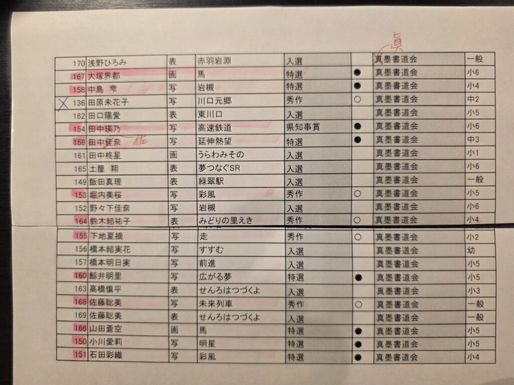 なお、秀作以上(⚫️と◯印のある人→ピンクの蛍光ペン)は、表彰式出席対象となります。